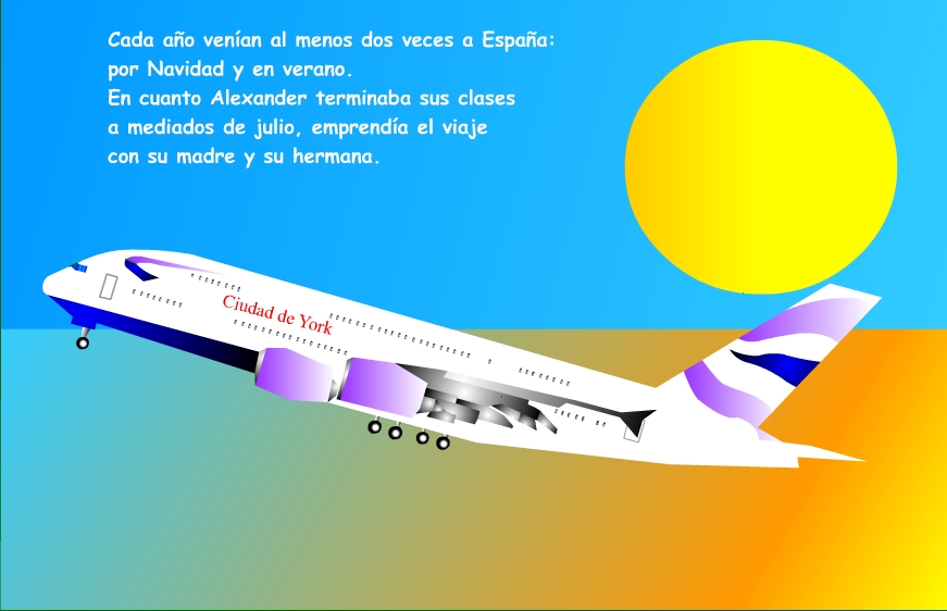 Cuento infantil: El alma del almendro. Lámina 12: Alexander viaja en avión con su madre y su hermana Ariadne.