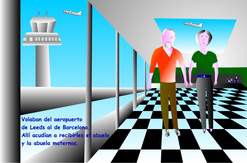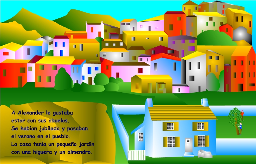 Cuento infantil: El alma del almendro. Lámina 13. Los abuelos de Alexander le reciben en España.