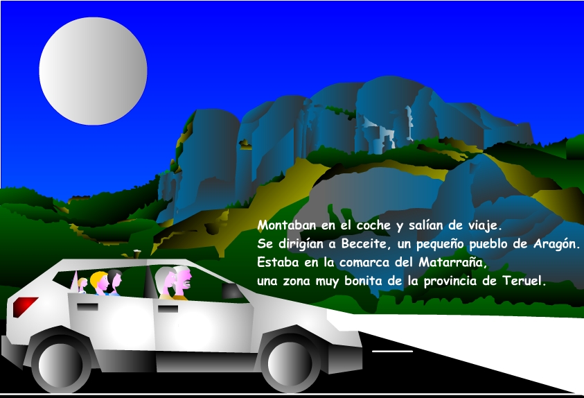 Cuento infantil: El alma del almendro. Lámina 14. Alexander, su madre y su hermana viajan a la comarca del Matarraña (Teruel).