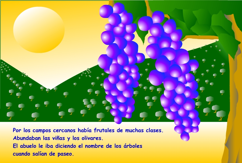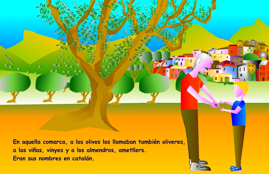 Cuento: El alma del almendro. Lámina 18. El abuelo de Alexander le habla sobre las viñas y los olivos de la comarca del Matarraña (Teruel, España)