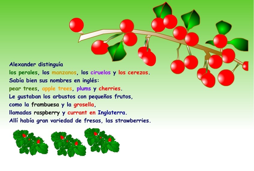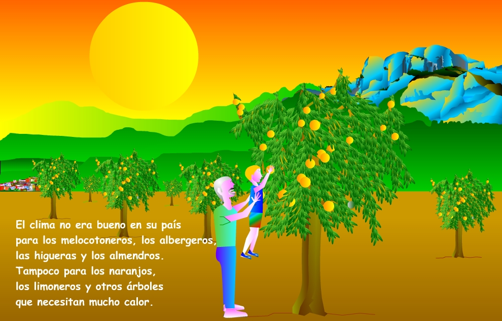 Cuento: El alma del almendro. Lámina 20. Alexander aprende sobre los melocotoneros, los albergeros, las higueras y los almendros.